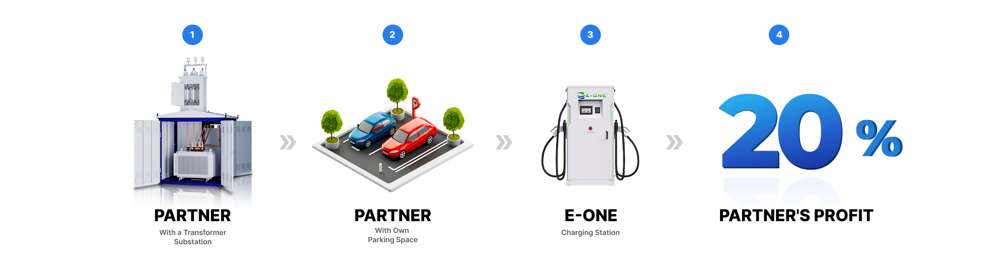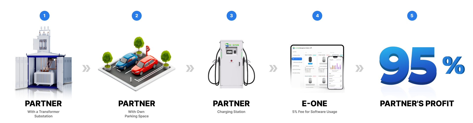 - LLC “E-ONE” connects the charging stations to a unified software system and ensures uninterrupted technical support.