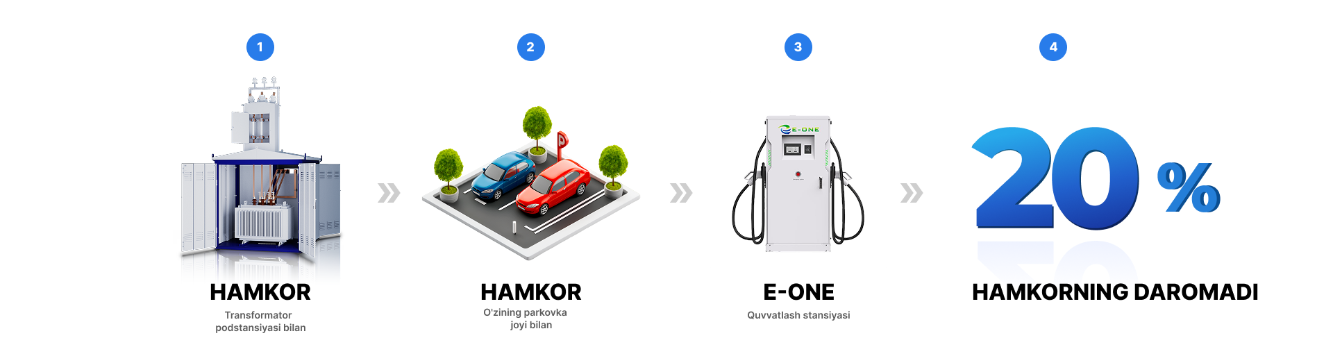 Agar ko‘chmas mulk egasi quvvatlash stansiyalarini o‘rnatish uchun joy va transformator punktida (TP) yetarli quvvatga ega elektr ulanish nuqtasini taqdim etsa, shuningdek, transformatorni ijara oluvchi «E-ONE» MCHJ hisobidan almashtirish shartini qabul qilsa, yer uchastkasini ijaraga berish shartnomasi tuziladi. Ijara to‘lovi ishlatilgan elektr energiyasi summasining 10% miqdorida belgilanadi. Shu bilan birga, almashtiriladigan transformator «E-ONE» MCHJ mulkiga o‘tadi, yangi o‘rnatilgan transformator esa Ijara beruvchining mulkiga aylanadi.