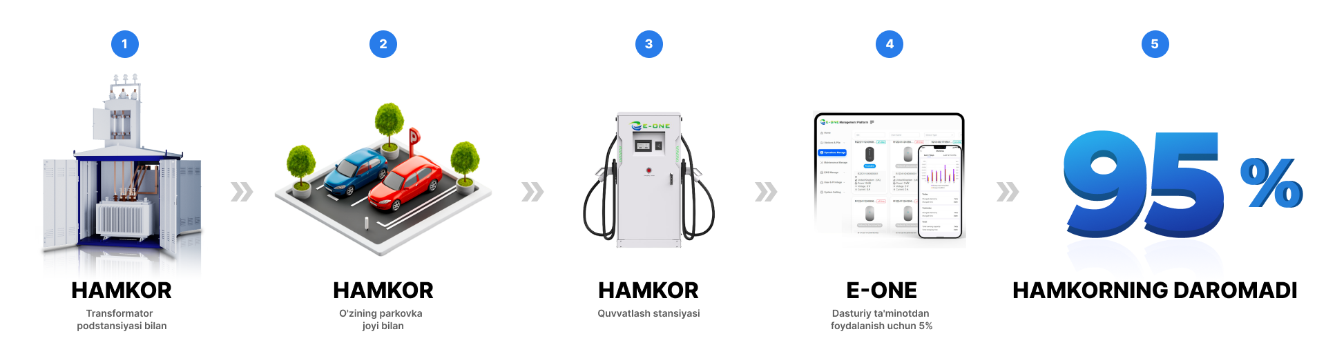 - «E-ONE» MCHJ quvvatlash stansiyalarini yagona dasturiy ta’minot tizimiga ulaydi va ularning uzluksiz texnik xizmat ko‘rsatishini ta’minlaydi.